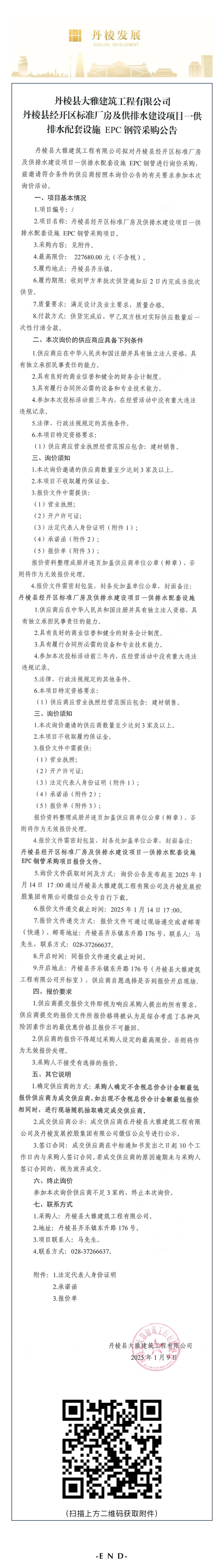 丹棱縣大雅建筑工程有限公司丹棱縣經(jīng)開區(qū)標(biāo)準(zhǔn)廠房及供排水建設(shè)項(xiàng)目一供排水配套設(shè)施 EPC鋼管采購公告