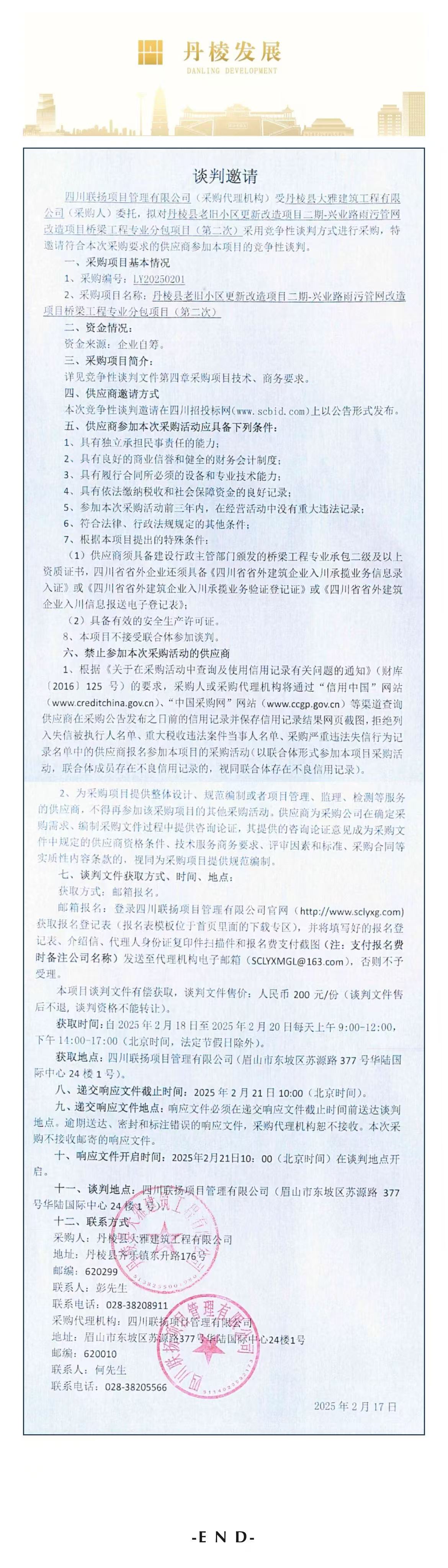 丹棱縣老舊小區(qū)更新改造項(xiàng)目二期-興業(yè)路雨污管網(wǎng)改造項(xiàng)目橋梁工程專業(yè)分包項(xiàng)目談判邀請公告(第二次)