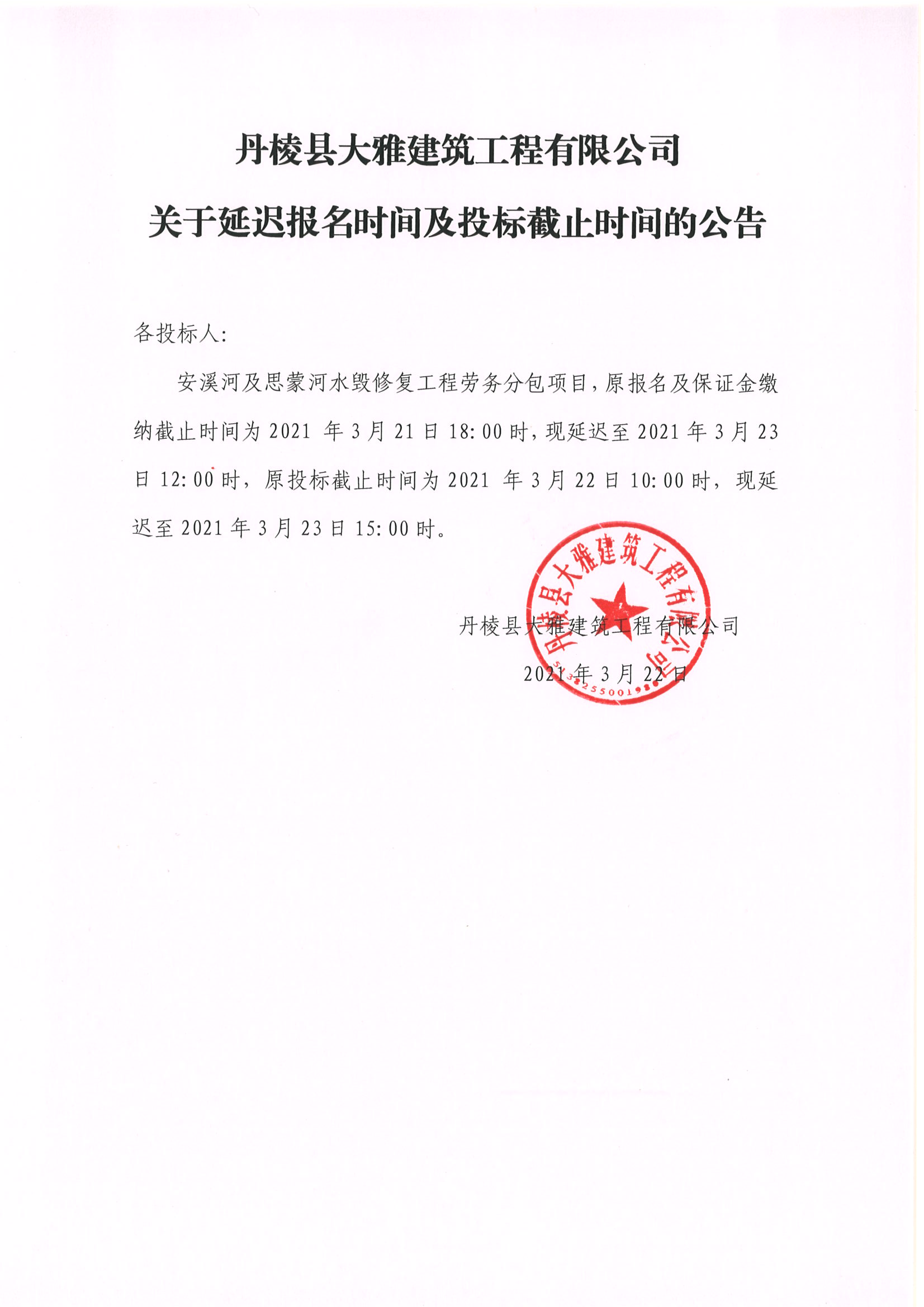 【大雅建筑公司】關(guān)于安溪河及思蒙河水毀修復(fù)工程勞務(wù)分包項目延遲報名時間及投標(biāo)截止時間的公告