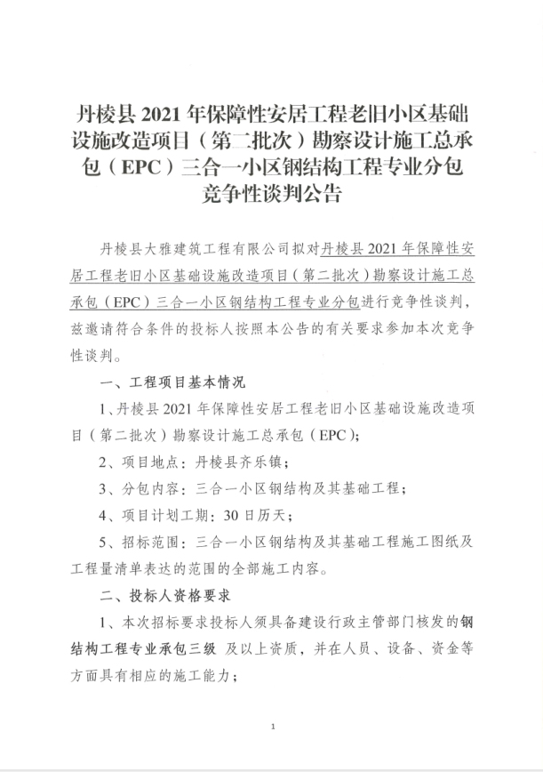 【大雅建筑公司】丹棱縣2021年保障性安居工程老舊小區(qū)基礎設施改造項目(第二批次)勘察設計施工總承包(EPC)三合一小區(qū)鋼結構工程專業(yè)分包競爭性談判公告