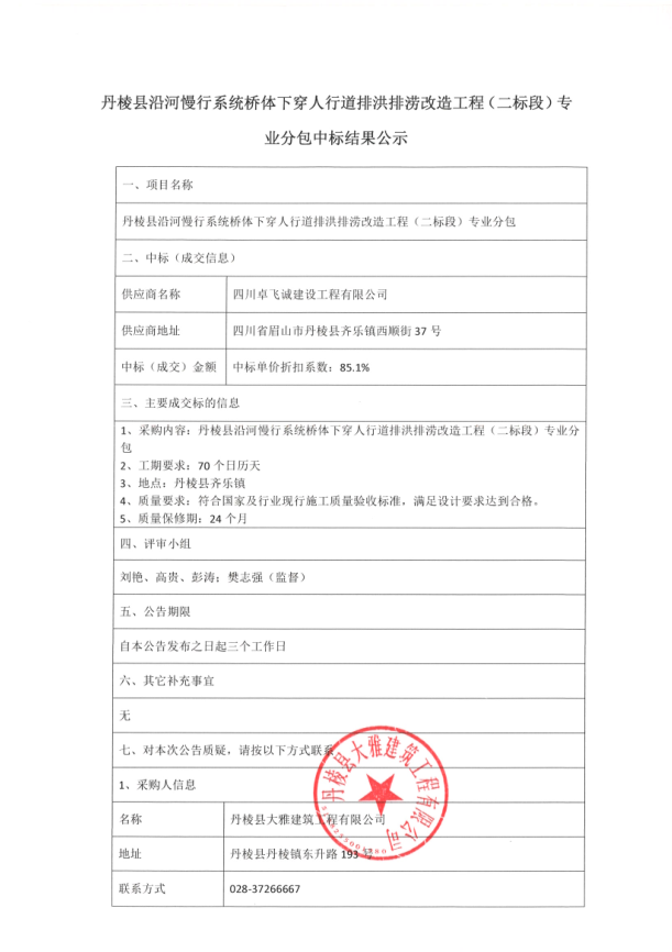 【大雅建筑公司】丹棱縣沿河慢行系統(tǒng)橋體下穿人行道排洪排澇改造工程(二標段)專業(yè)分包中標結(jié)果公示