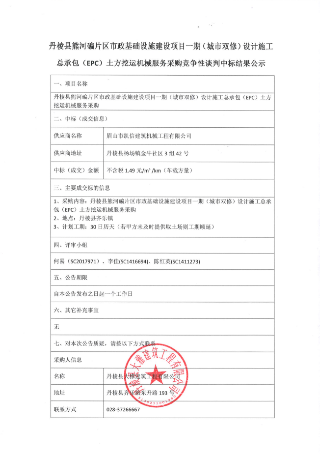 丹棱縣熊河碥片區(qū)市政基礎(chǔ)設(shè)施建設(shè)項(xiàng)目一期(城市雙修)設(shè)計(jì)施工 總承包(EPC)土方挖運(yùn)機(jī)械服務(wù)采購競(jìng)爭性談判中標(biāo)結(jié)果公示