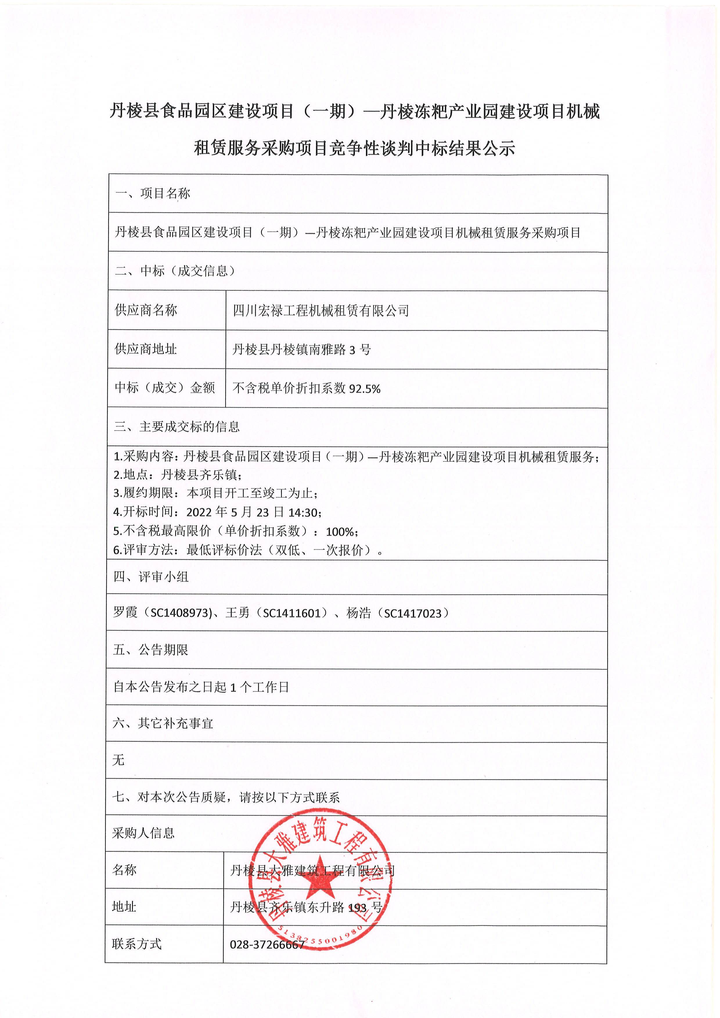 丹棱縣食品園區(qū)建設項目(一期)-丹棱凍粑產(chǎn)業(yè)園建設項目機械 租賃服務采購項目競爭性談判中標結果公示