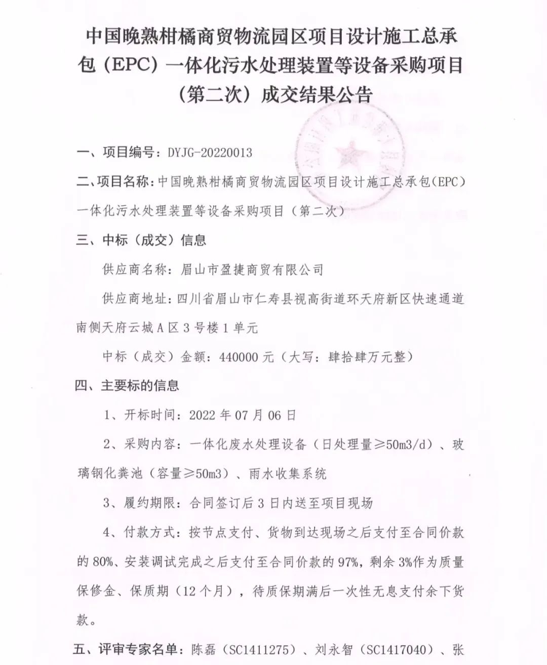 中國晚熟柑橘商貿(mào)物流園區(qū)項目設(shè)計施工總承包(EPC)一體化污水處理裝置等設(shè)備采購項目(第二次)成交結(jié)果公告