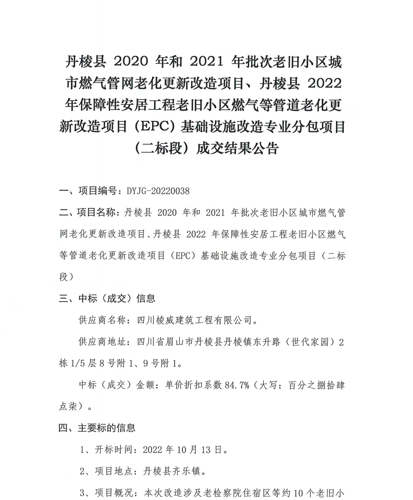 丹棱縣2020年、2021年和2022年老舊小區(qū)城市燃?xì)夤芫W(wǎng)老化更新改造項(xiàng)目基礎(chǔ)設(shè)施改造專業(yè)分包項(xiàng)目(二標(biāo)段)成交結(jié)果公告