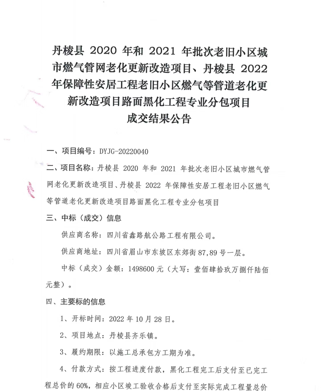 丹棱縣2020年、2021年、2022年保障性安居工程老舊小區(qū)燃氣等管道老化更新改造項目路面黑化工程專業(yè)分包項目成交結果公告