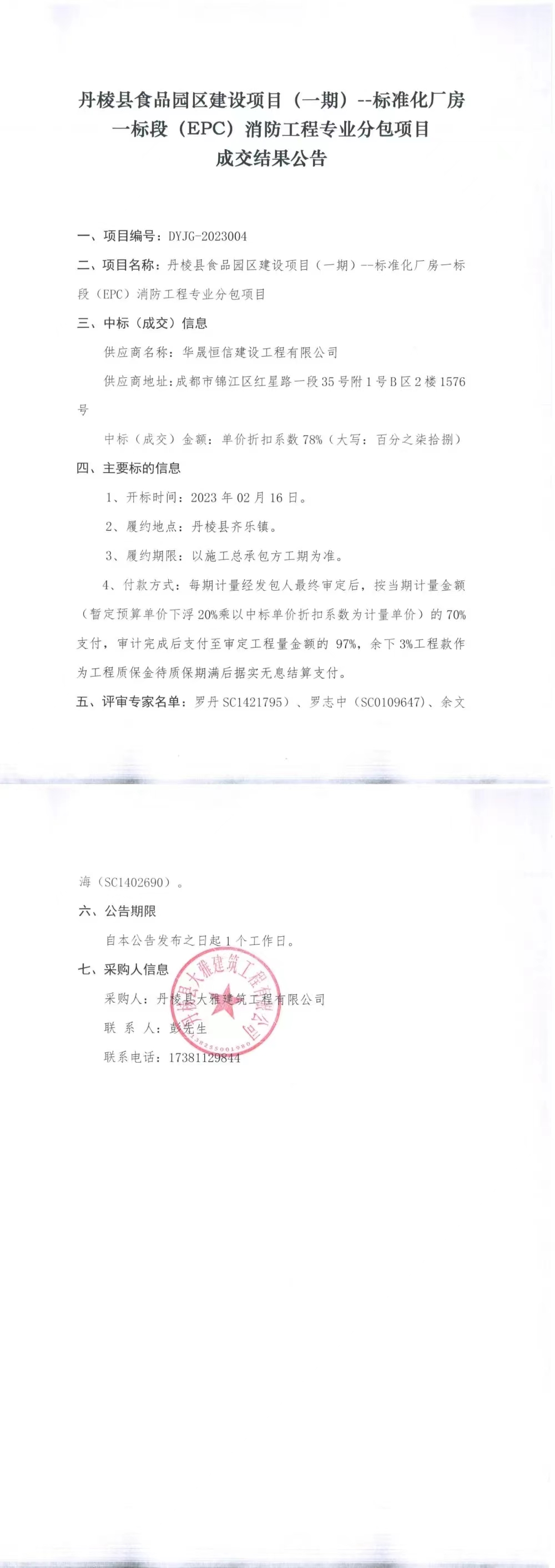 丹棱縣食品園區(qū)建設項目(一期)--標準化廠房一標段(EPC)消防工程專業(yè)分包項目成交結(jié)果公告