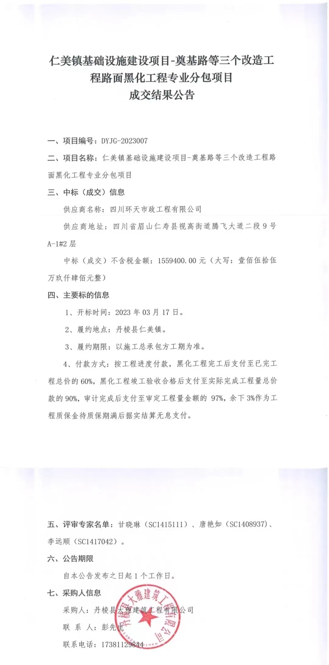 仁美鎮(zhèn)基礎(chǔ)設(shè)施建設(shè)項目-奠基路等三個改造工程路面黑化工程專業(yè)分包項目成交結(jié)果公告