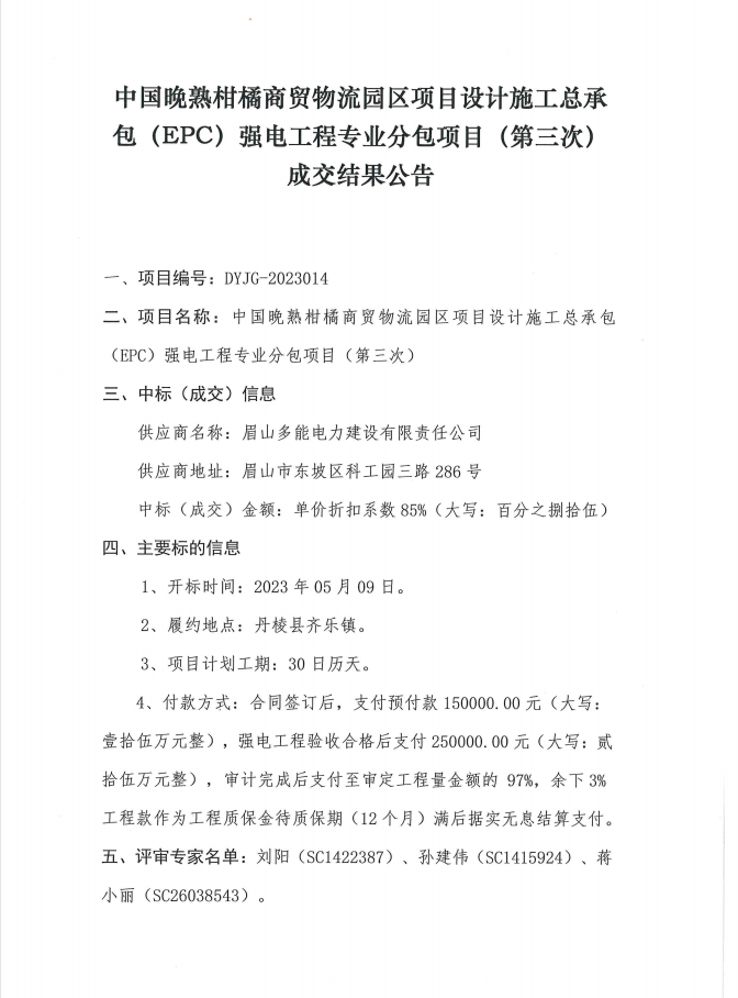 中國晚熟柑橘商貿(mào)物流園區(qū)項目設(shè)計施工總承包(EPC)強電工程專業(yè)分包項目(第三次)成交結(jié)果公告