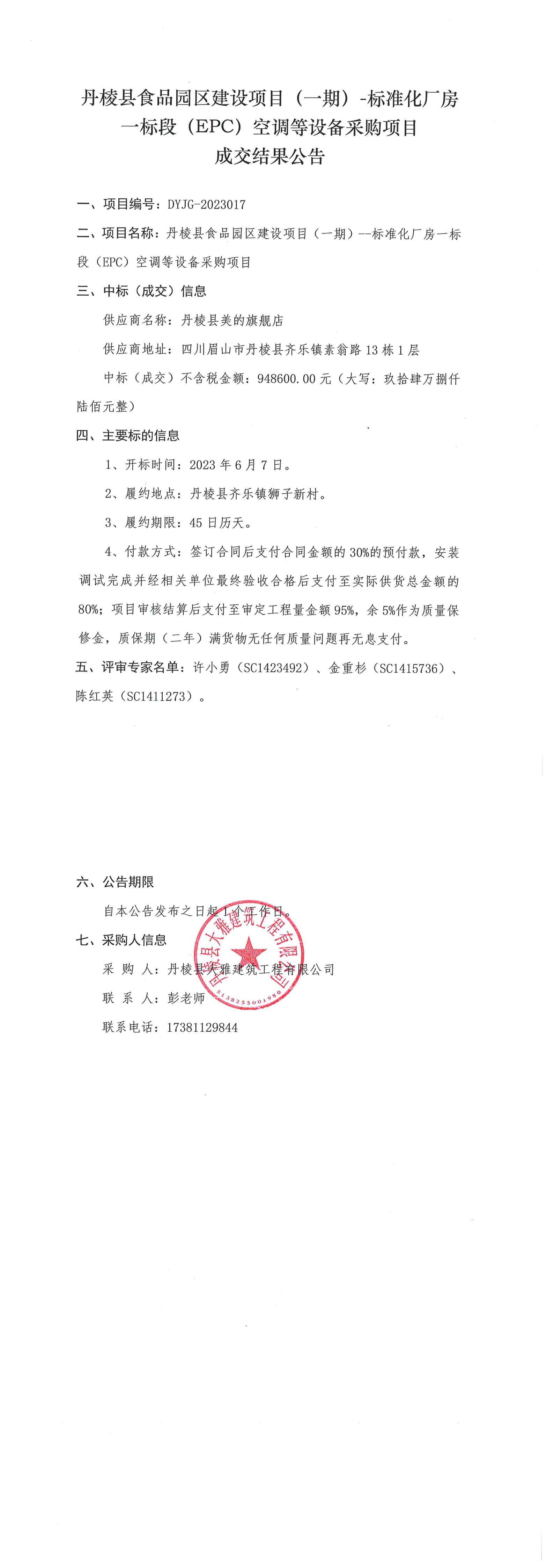 丹棱縣食品園區(qū)建設(shè)項目(一期)-標準化廠房一標段(EPC)空調(diào)等設(shè)備采購項目成交結(jié)果公告