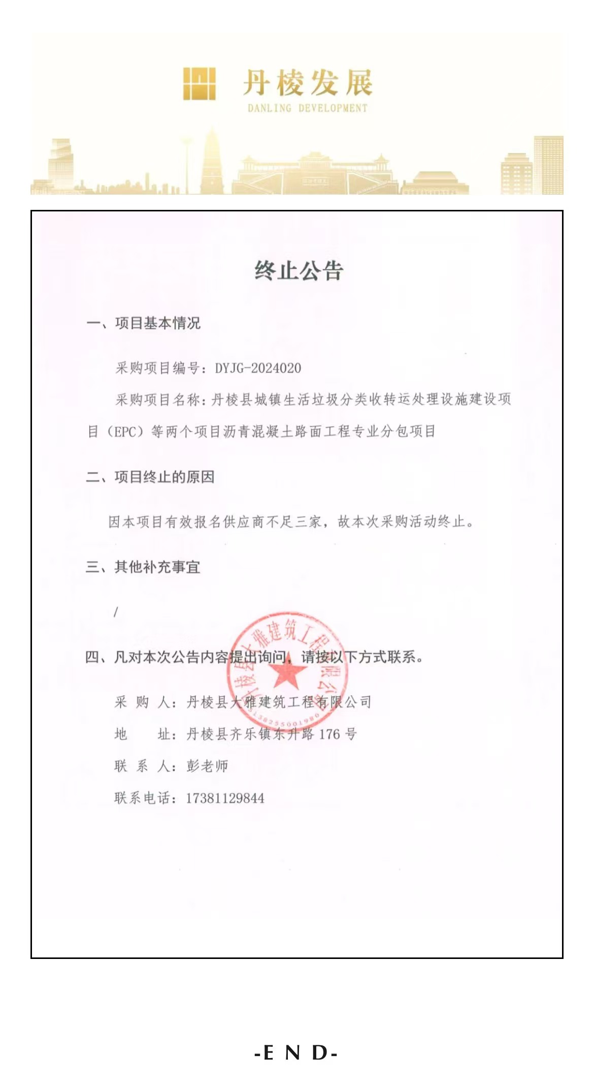 丹棱縣城鎮(zhèn)生活垃圾分類收轉(zhuǎn)運(yùn)處理設(shè)施建設(shè)項(xiàng)目(EPC)等兩個項(xiàng)目瀝青混凝土路面工程專業(yè)分包項(xiàng)目終止公告