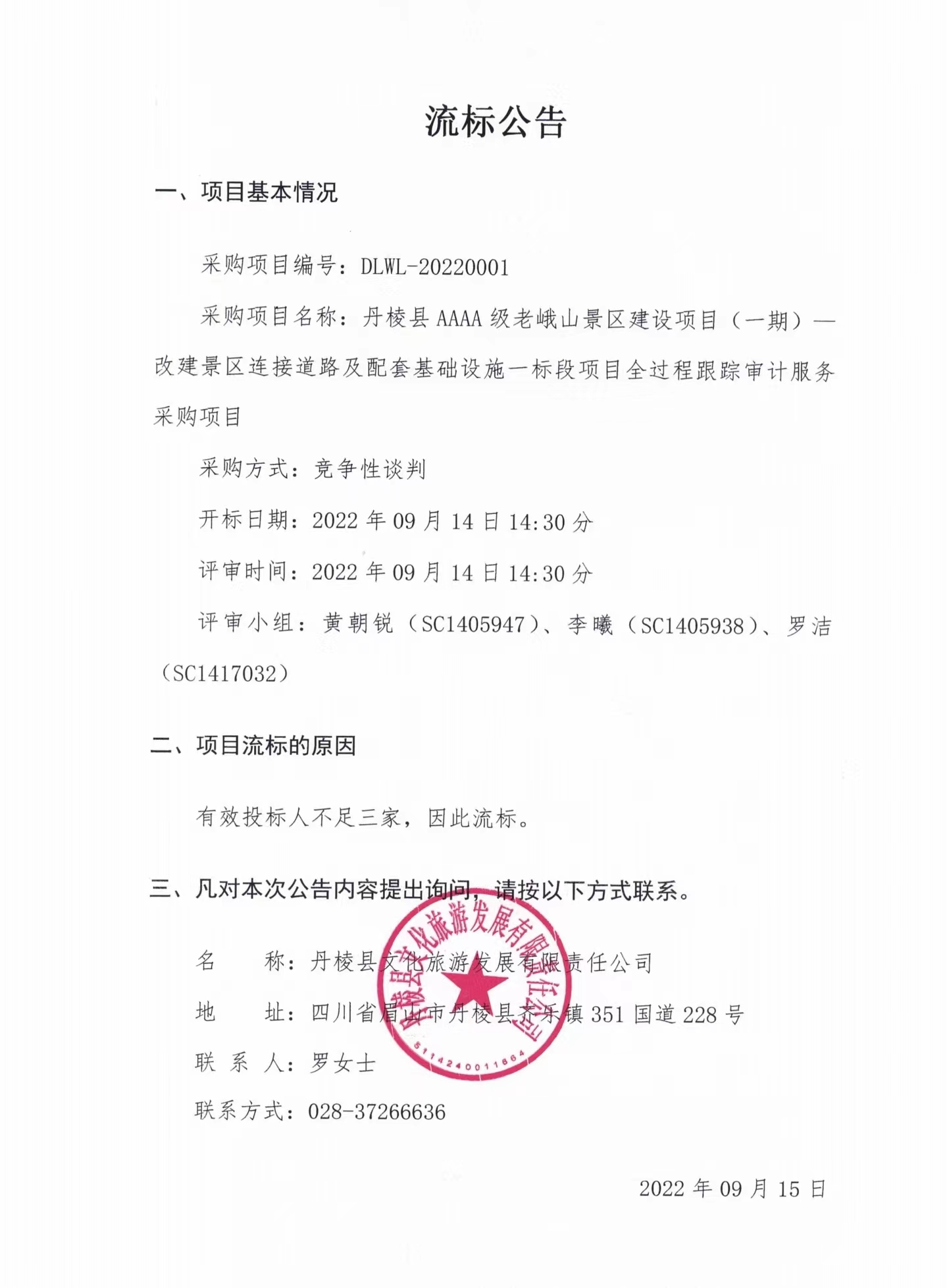 丹棱縣AAAA級老峨山景區(qū)建設(shè)項目(一期)--改建景區(qū)連接道路及配套基礎(chǔ)設(shè)施一標(biāo)段項目全過程跟蹤審計服務(wù)采購項目流標(biāo)公告
