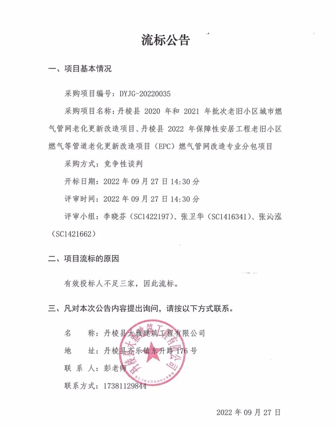 丹棱縣 2020 年、2021年及2022年批次老舊小區(qū)城市燃氣管網(wǎng)老化更新改造項目燃氣管網(wǎng)改造專業(yè)分包項目流標(biāo)公告