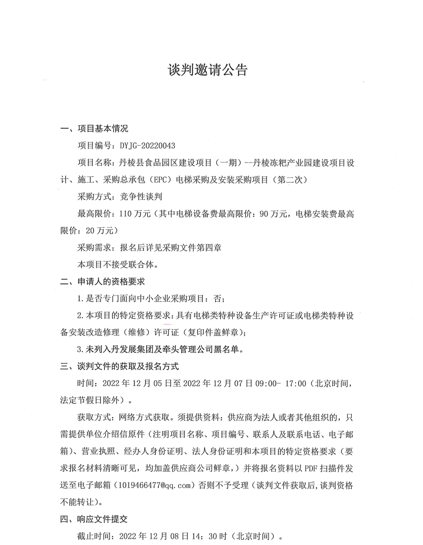 丹棱縣食品園區(qū)建設(shè)項(xiàng)目 (一期)--丹樓凍把產(chǎn)業(yè)園建設(shè)項(xiàng)目設(shè)計(jì)、施工、采購總承包 (EPC) 電梯采購及安裝采購項(xiàng)目 (第二次)談判邀請公告