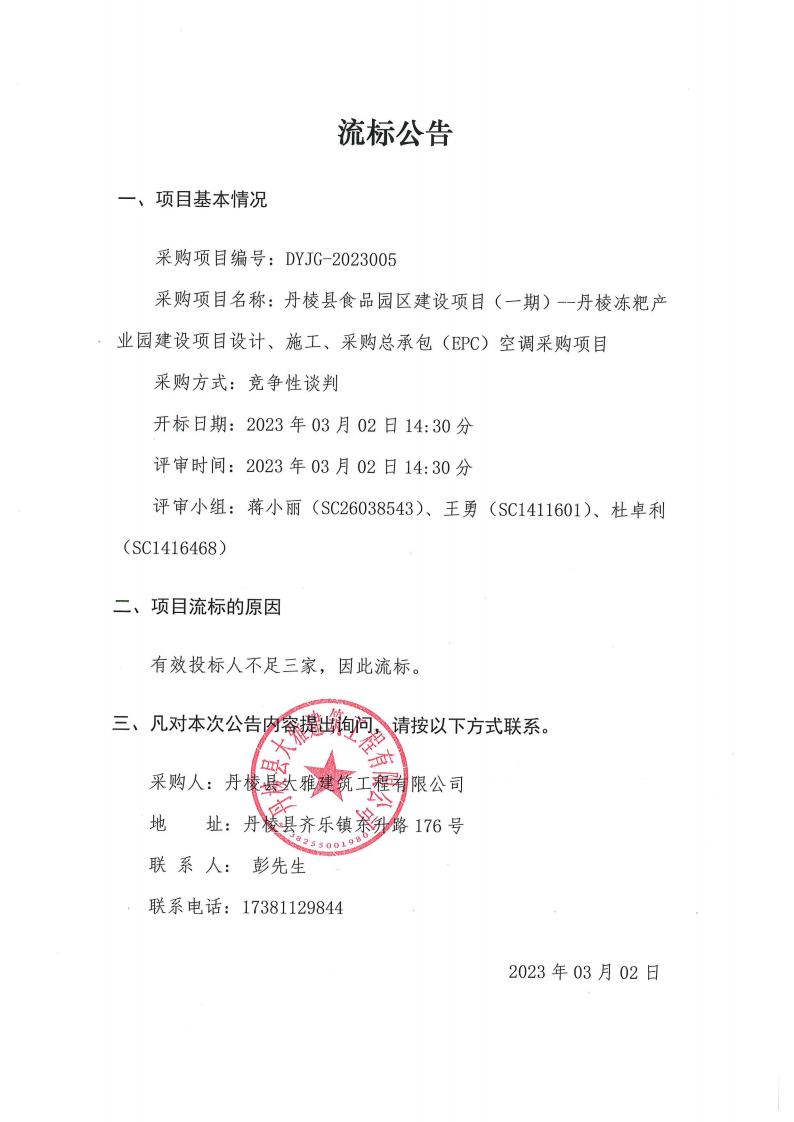 丹棱縣食品園區(qū)建設(shè)項目(一期)--丹棱凍粑產(chǎn)業(yè)園建設(shè)項目設(shè)計、施工、采購總承包(EPC)空調(diào)采購項目流標(biāo)公告