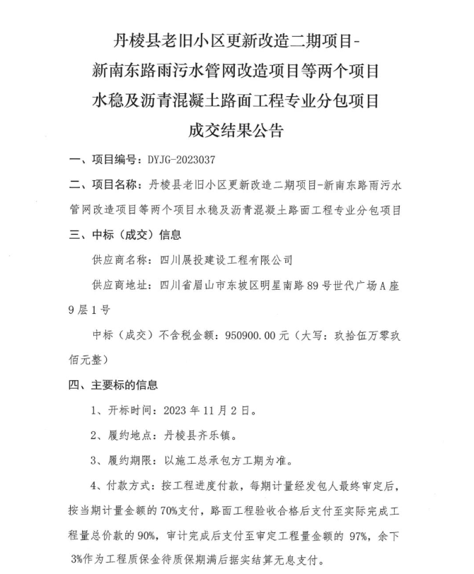 丹棱縣老舊小區(qū)更新改造二期項(xiàng)目-新南東路雨污水管網(wǎng)改造項(xiàng)目等兩個(gè)項(xiàng)目水穩(wěn)及瀝青混凝土路面工程專業(yè)分包項(xiàng)目成交結(jié)果公告