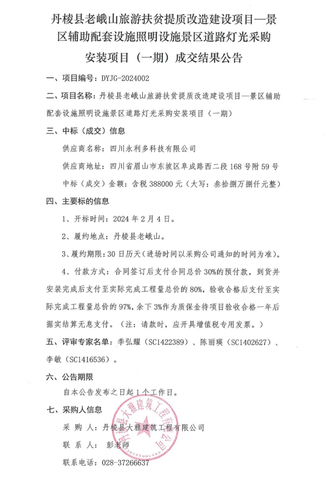 丹棱縣老峨山旅游扶貧提質(zhì)改造建設項目—景區(qū)輔助配套設施照明設施景區(qū)道路燈光采購安裝項目(一期)成交結果公告