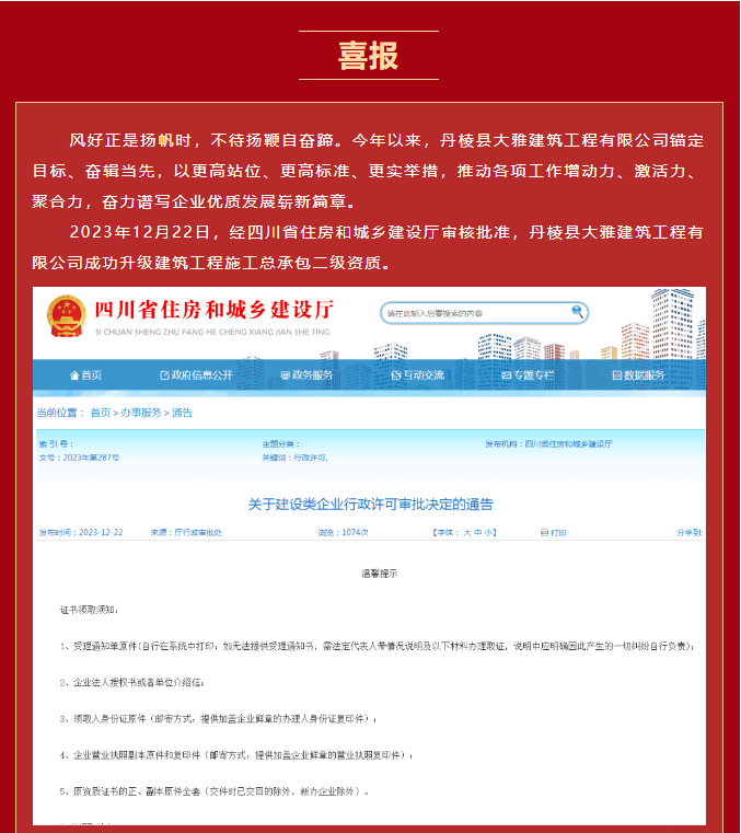 【縣大雅建筑公司】喜報!成功升級“建筑工程施工總承包二級”資質(zhì)!